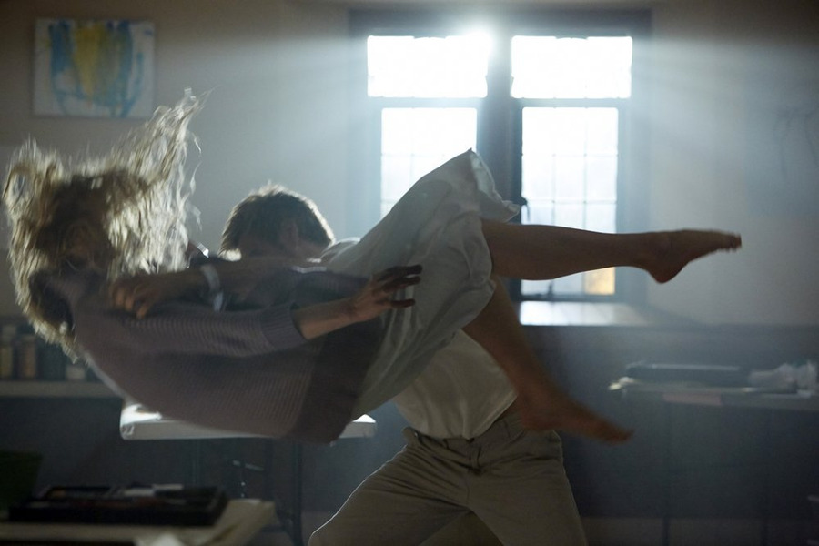 …and we learn that Constantine is at Ravenscar to have them make him stop believing in demons. That doesn’t seem likely sir, especially when you are walking the halls of Ravenscar and they are littered with roaches. And those critters lead you into an art room, where a woman is painting a word onto a wall covered with even more roaches. Yuck! Apprehensively, Constantine performs an exorcism that makes the paint supplies and stained glass windows explode, but lead to the evacuation of the spirit from the woman’s body and delivers a message to Constantine – “LIV DIE.”