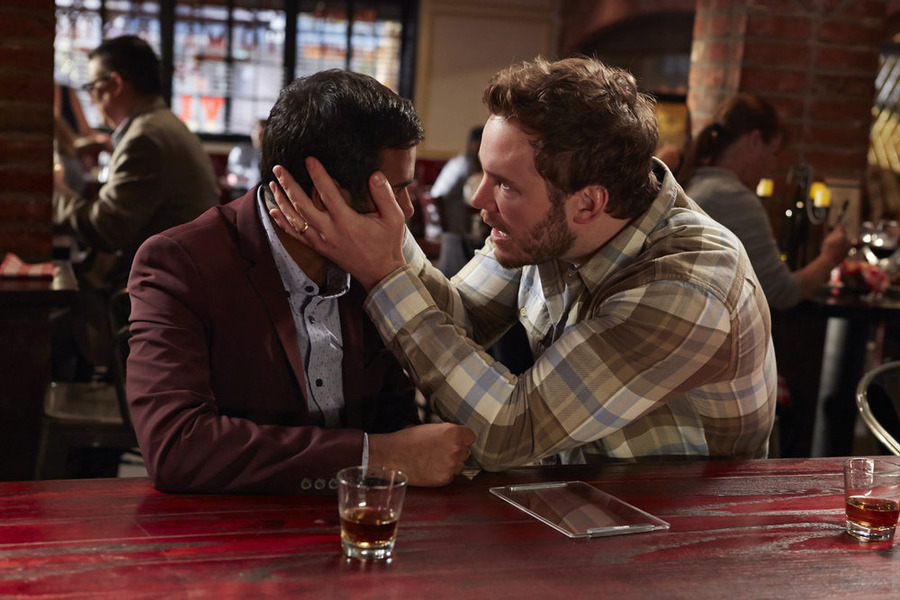 PARKS AND RECREATION -- "Ron and Jammy" Episode 702 -- Pictured: (l-r) Aziz Ansari as Tom Haverford, Chris Pratt as Andy Dwyer -- (Photo by: Ben Cohen/NBC)