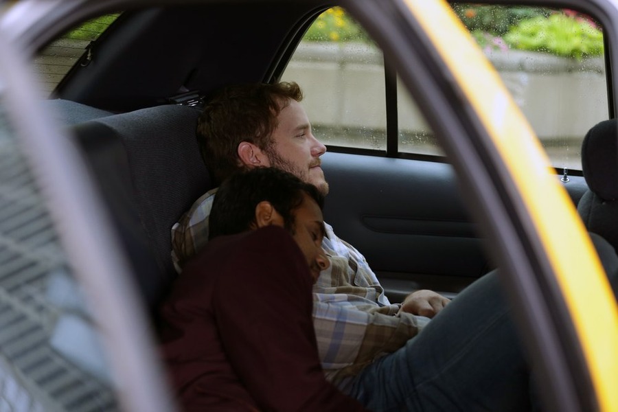 PARKS AND RECREATION -- "Ron and Jammy" Episode 702 -- Pictured: (l-r) Chris Pratt as Andy Dwyer, Aziz Ansari as Tom Haverford -- (Photo by: Elizabeth Morris/NBC)