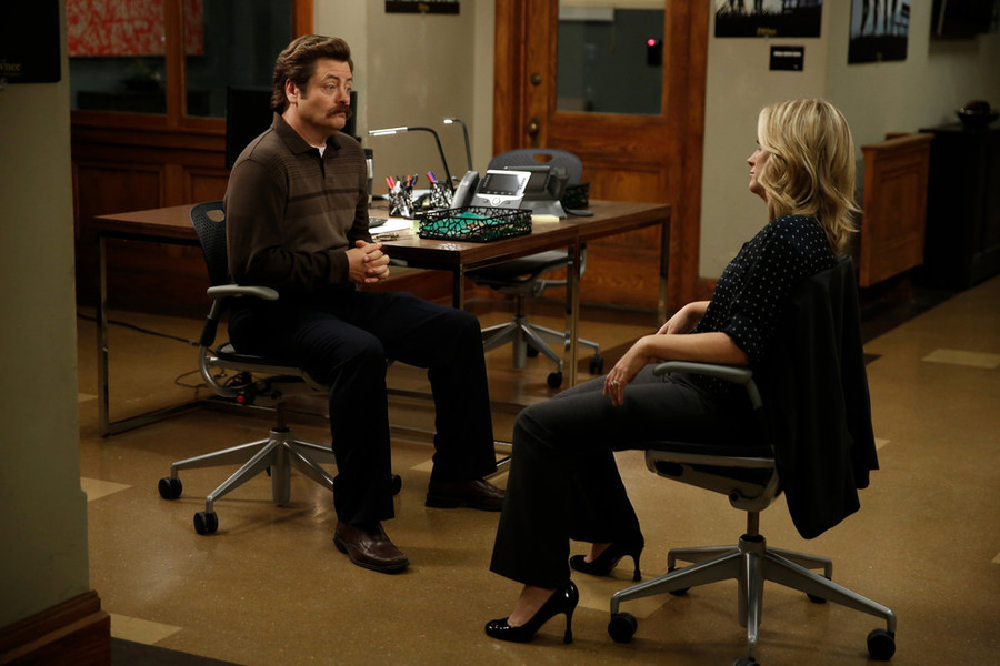 PARKS AND RECREATION -- "Funkin' Gonuts" Episode 704 -- Pictured: (l-r) Amy Poehler as Leslie Knope, Nick Offerman as Ron Swanson -- (Photo by: Ben Cohen/NBC)