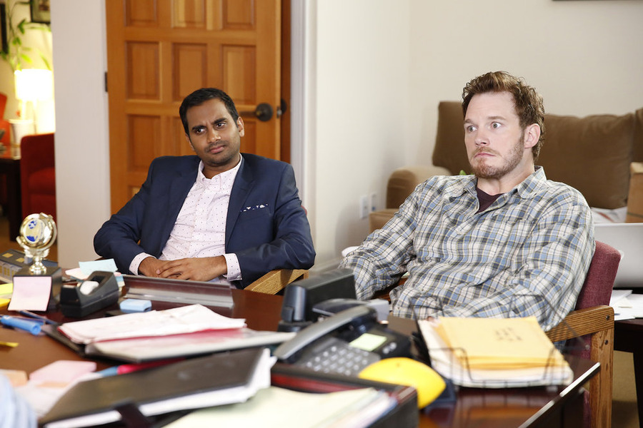 PARKS AND RECREATION -- "William Henry Harrison" Episode 705 -- Pictured: (l-r) Aziz Ansari as Tom Haverford, Chris Pratt as Andy Dwyer -- (Photo by: Greg Gayne/NBC)