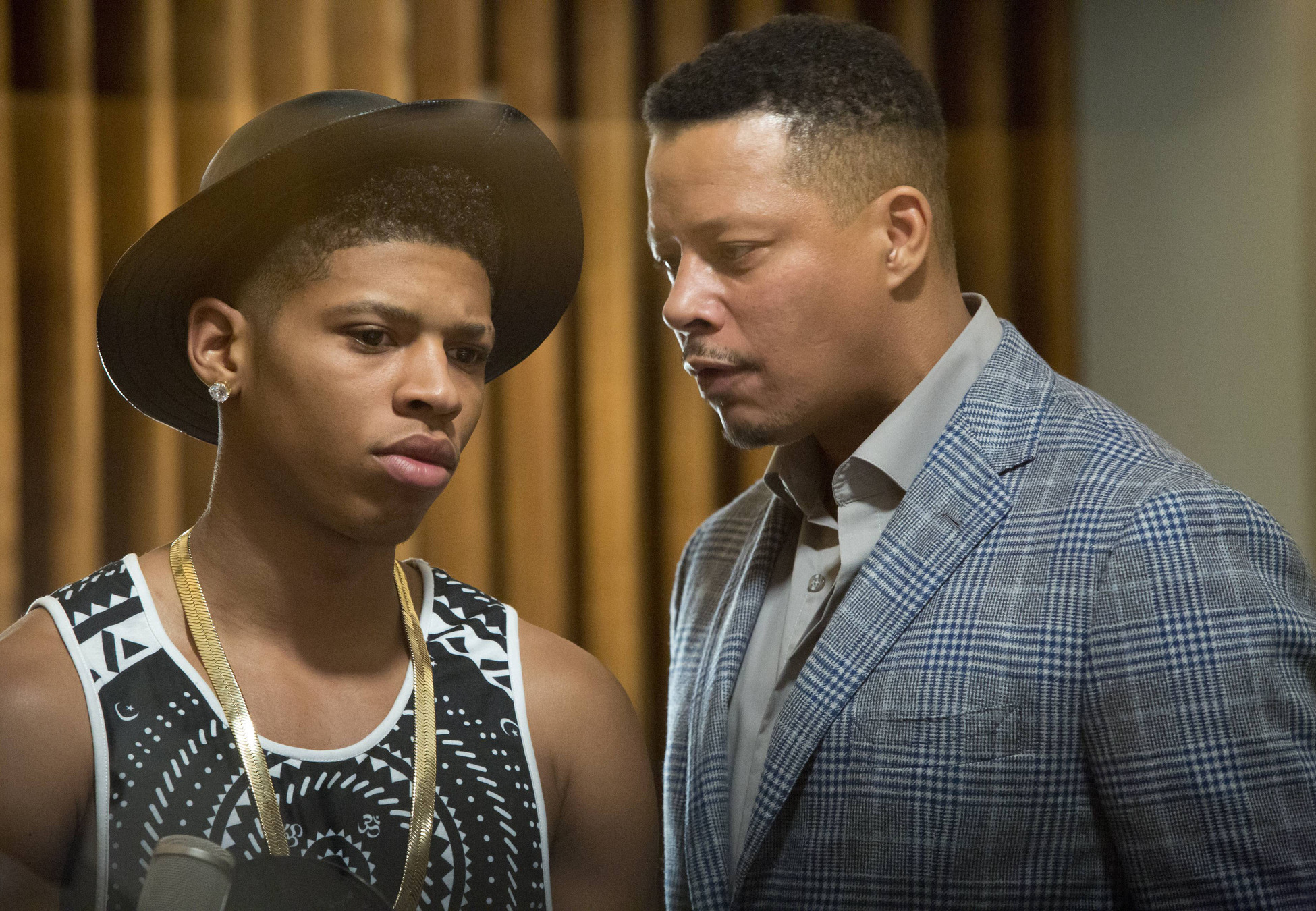 EMPIRE: Lucious (Terrence Howard, R) talks to Hakeem (Bryshere Gray, L) in the "False Imposition" episode of EMPIRE airing Wednesday, Jan. 28 (9:00-10:00 PM ET/PT) on FOX. ©2014 Fox Broadcasting Co. CR: Chuck Hodes/FOX