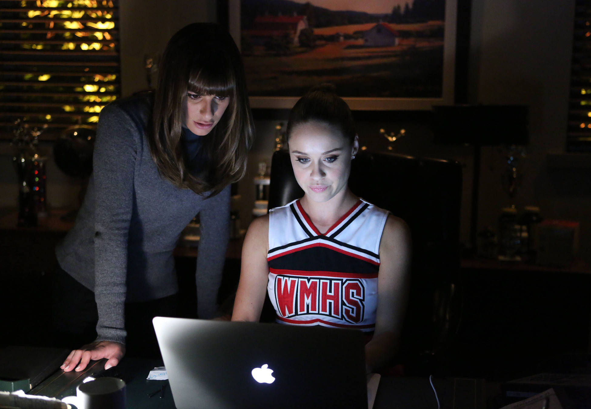 GLEE: Kitty (Becca Tobin, R) helps Rachel (Lea Michele, L) find the perfect set list to win in the "The Hurt Locker, Part Two" episode of GLEE airing Friday, Jan. 30 (9:00-10:00 PM ET/PT) on FOX. ©2014 Fox Broadcasting Co. CR: Beth Dubber/FOX