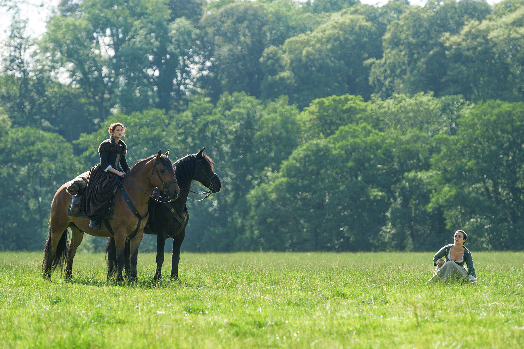 The first set of photos (below) are stills, which give us a first look at the Duke of Sandringham (Simon Callow) at Castle Leoch; Jamie and Claire at Lallybroch; Claire, Jenny (Laura Donnelly), and Murtagh (Duncan Lacroix) searching for a missing Jamie; Black Jack at Wentworth Prison, and much more.