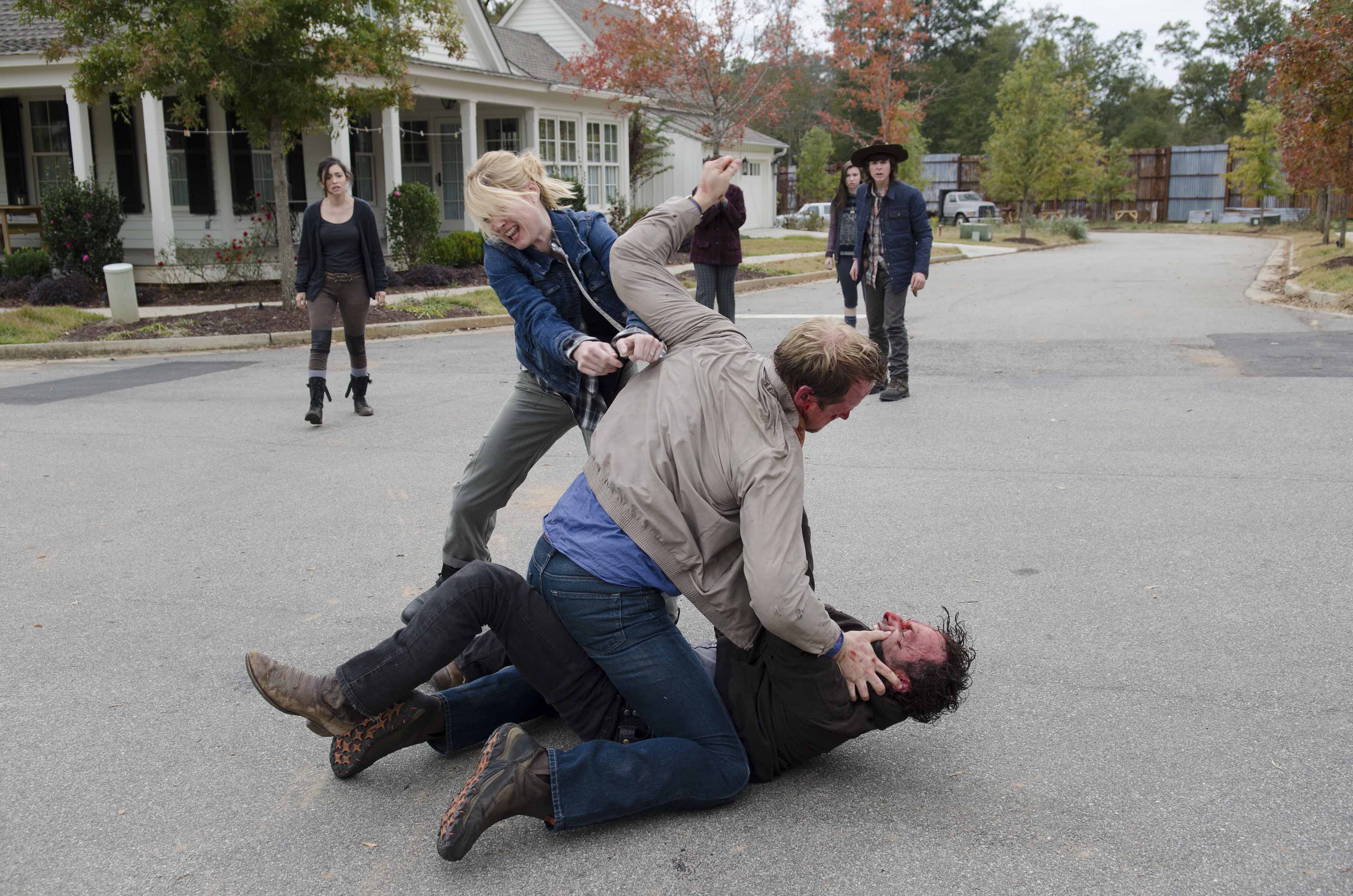 But the actions that had many on Twitter tweeting words of rage and/or scratching their heads is Rick (Andrew Lincoln) losing his damn mind and going all cray-cray in The Walking Dead, episode 15, “Try.” Apparently, when Rick shaved off his beard when arriving into Alexandria, he began to take on Shane Walsh (Jon Bernthal) like behavior. Rick is coveting Pete’s (Corey Brill) wife, Jessie (Alexandra Breckenridge). We all know that Pete is a douchebag who abuses his wife, but Rick’s desire to want to kill him bubbled up into the ultimate amount of rage. This rage resulted into a bloody street brawl between the two and in the midst of the fight Pete pushed Jessie to ground and Rick did the same with Carl. Oh, hello no! Thank goodness Michonne knocked Rick which stopped the fight.