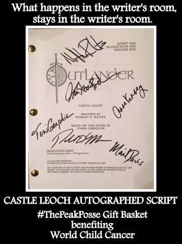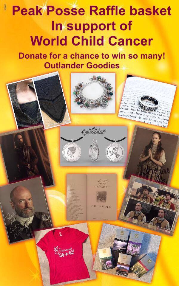 And PLEASE follow @BonnieTerbush and/or @ThePeakPosse on Twitter to find out #WhatsInTheBasket for all basket updates. As well as, visit and ‘like’ the Outlander-ThePeakposse Fundraiser page on Facebook, and follow their fundraising adventures. Each fundraiser they hold will raise money for a charity supported by an actor in the Starz hit series Outlander.