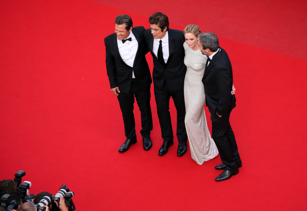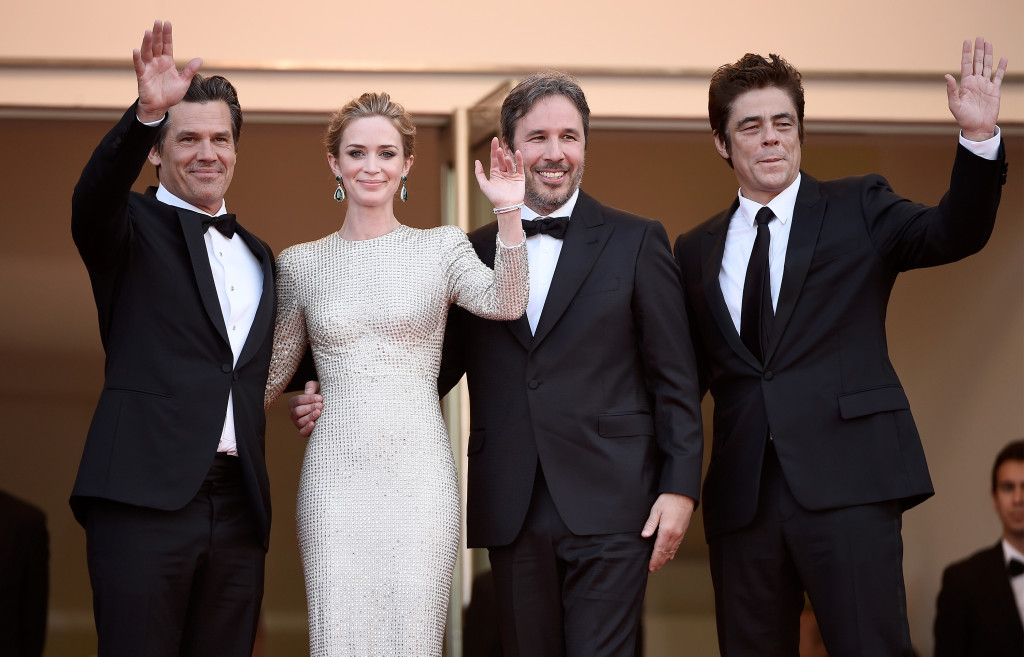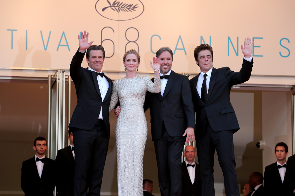 As we previously mentioned, one of the main contenders for high honors at the 2015 Cannes Film Festival is Lionsgate’s Sicario. Yesterday, stars Emily Blunt, Benicio del Toro, Josh Brolin, Director Denis Villeneuve, Producers Basil Iwanyk and Molly Smith, and Director of Photography Roger Deakins appeared at the Cannes official photo call at the and then completed a press conference for the film. Later that evening, cast and crew also walked the Palais des Festivals red carpet before Sicario‘s in-competition screening/world premiere.