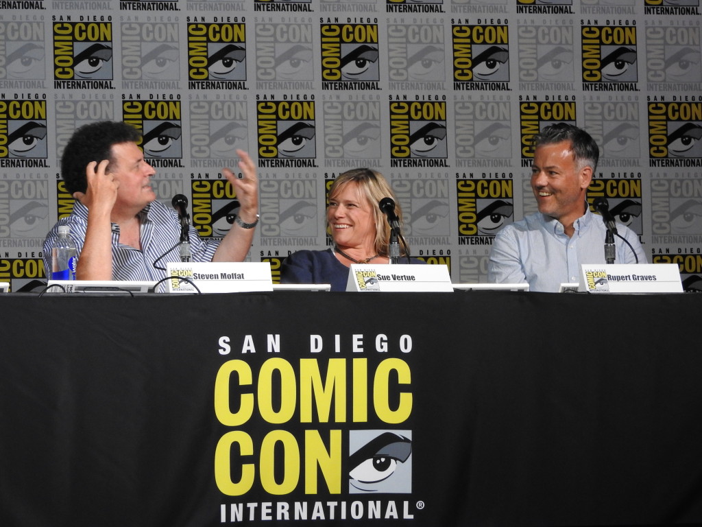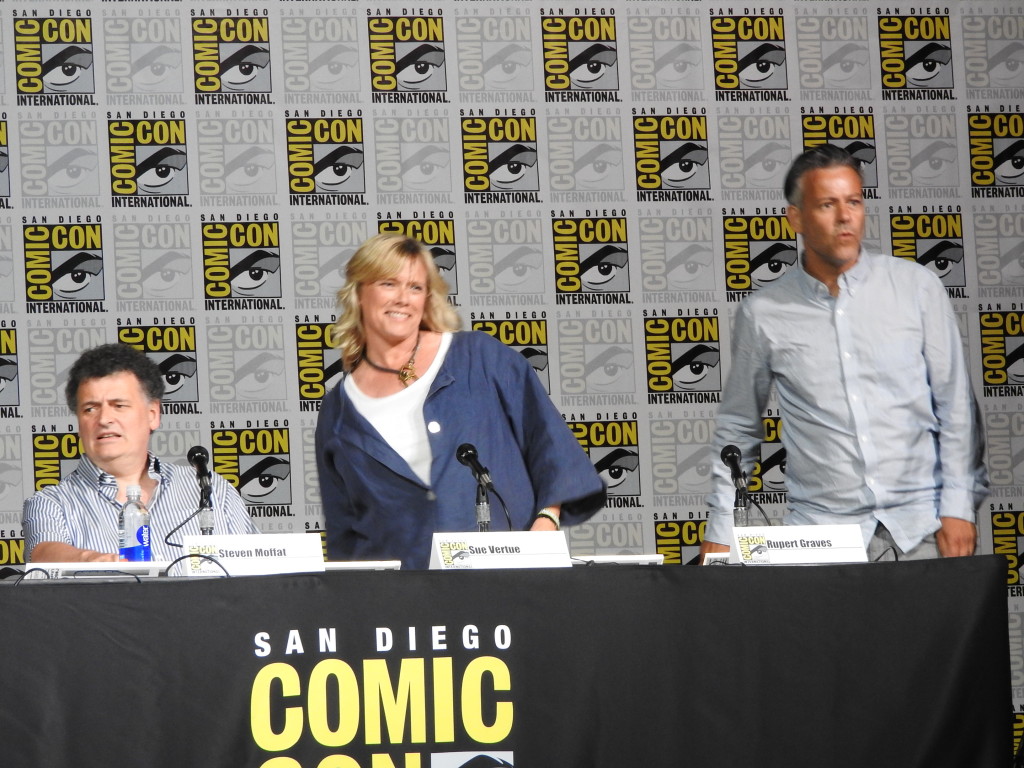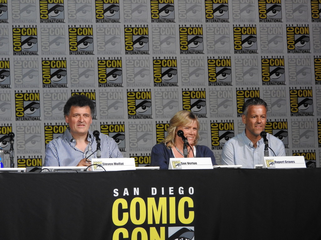 Earlier today, Executive Producers Steven Moffat and Sue Vertue, along with Inspector Lestrade himself, Rupert Graves, attended their San Diego Comic-Con panel to talk all things SHERLOCK! The panel kicked off with a special welcome video featuring Andrew Scott, Benedict Cumberbatch, and Mark Gatiss. The surprises continued when the panel gave Ballroom 20 an exclusive first look at the upcoming Series 4 SHERLOCK special, which takes place in Victorian-era London. You can watch both clips below: