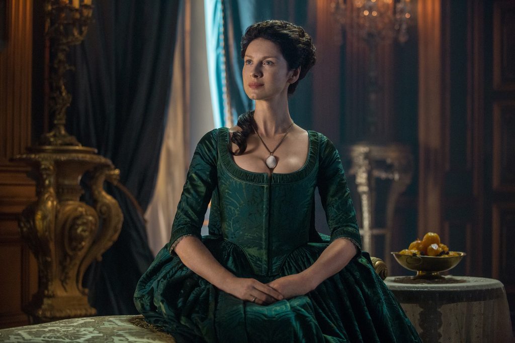 Claire arrived at Versailles, looking every bit of the regal lady, dressed in a gorgeous forest green embroidered, caped gown, her hair perfectly coiffed, the stone she received as a gift from Master Raymond nestled in her chest. She was led to Louis private rooms where he received her.