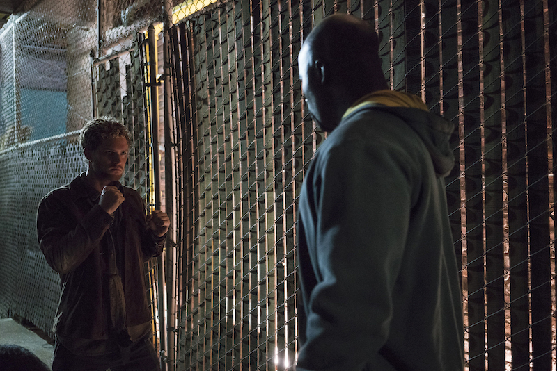 Within the first seconds of the trailer, we watch these (not so separate) worlds collide, as Misty Knight (Simone Missick) interrogates a handcuffed Jessica Jones (Krysten Ritter). They don’t get very far before Matt Murdock/Daredevil (Charlie Cox) steps in and offers his legal services to a slightly confused Jessica.