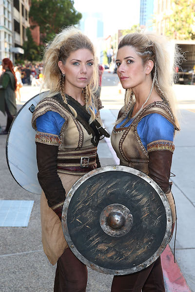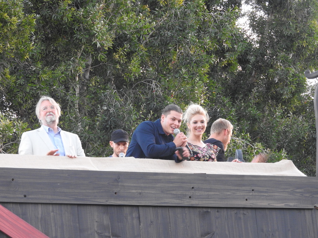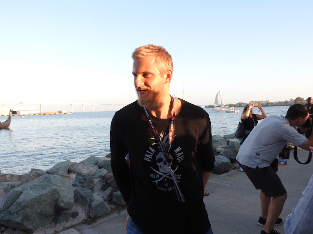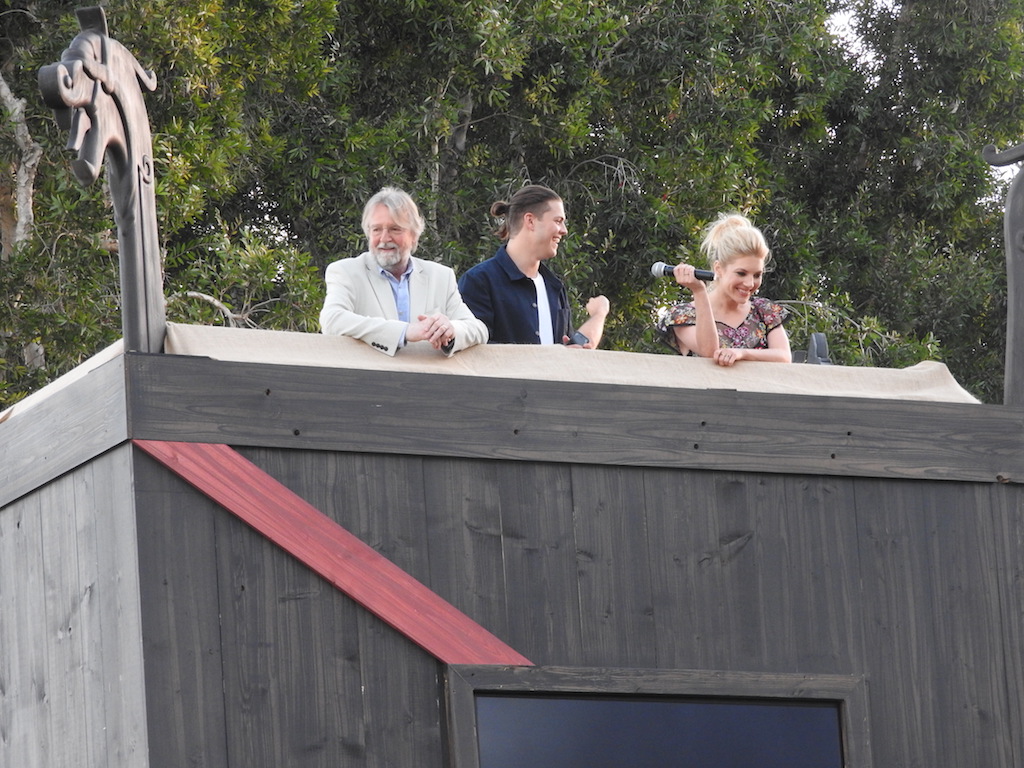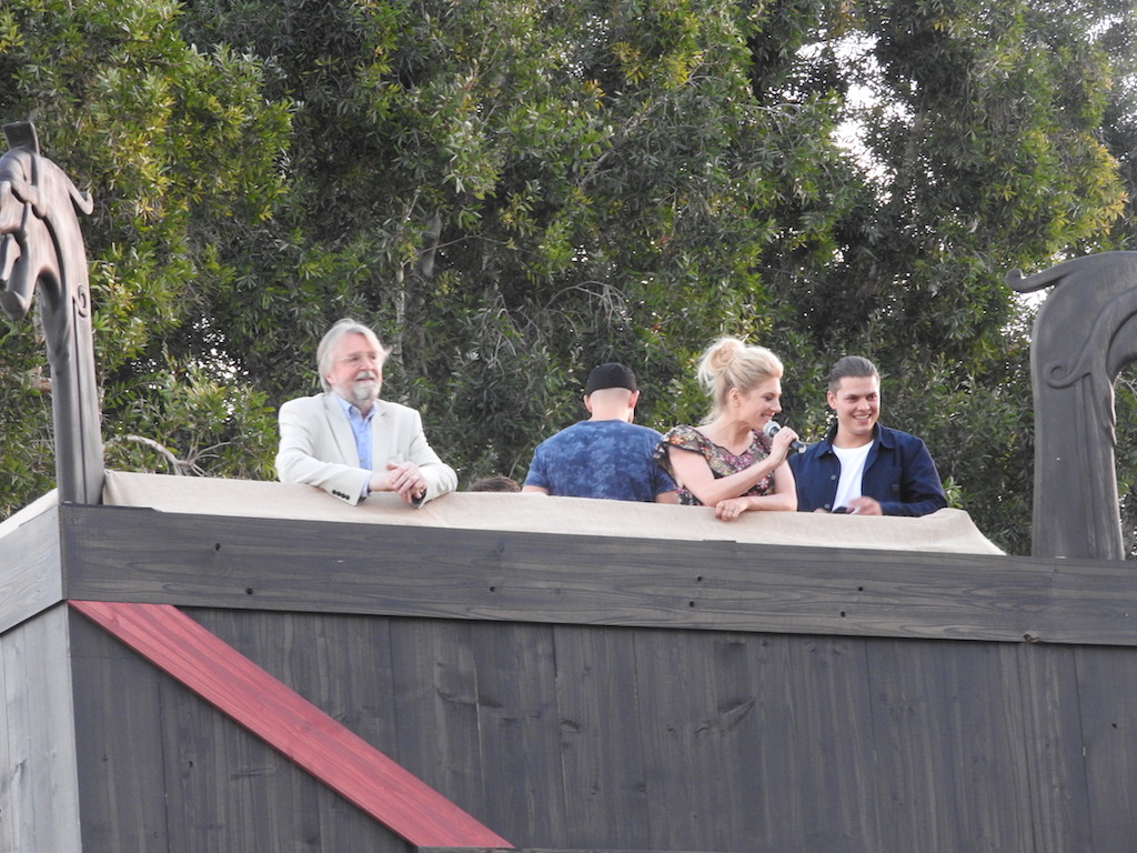Katheryn Winnick (Lagertha), Gustaf Skarsgard (Floki), Alexander Ludwig (Bjorn), Alex Høgh Andersen (Ivar), and Creator Michael Hirst greeted fans, debuted the new Season 5 trailer, and gave a major shout-out to cosplayers and folks who knew their Vikings’ trivia. We paid our respects to Ragnar, sending him off to the splendors of Valhalla. Then we chanted as a floating 45-foot replica Viking long-ship was set on fire. It was SO cool! Fans were also treated to their very own Vikings drinking horns.