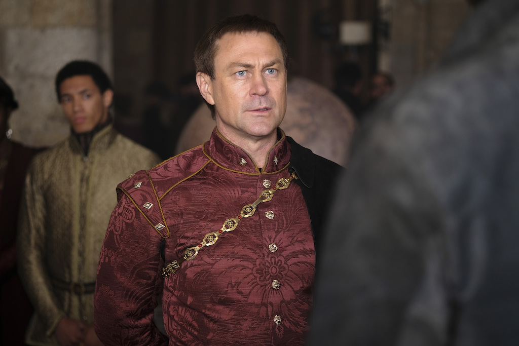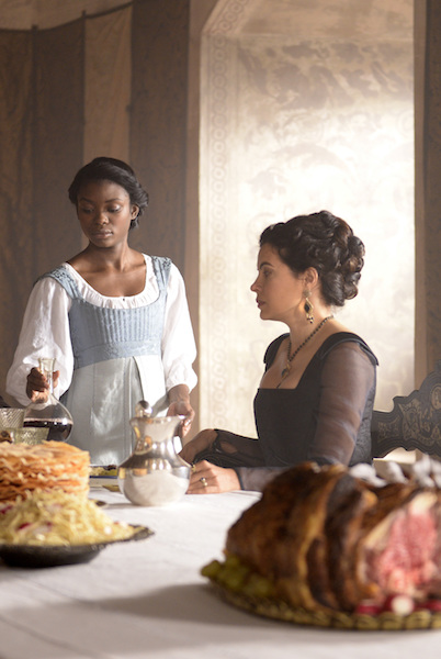 “Hell is Empty and All the Devils Are Here” (Season 1, Episode 6) covers the same period of time, but focusses on what’s going on inside the city while Rosvolio/Ronvolio are gone. We literally rewind to the moment Lady Capulet sees Rosaline ride off with the Montague. She hides the letter Rosaline leaves behind and tells Livia that her sister has been kidnapped by Benvolio. Lord Capulet goes straight to Escalus and Isabella (back from her trip to Venice) with the news and everyone is scandalized, even Lord Montague, who is also present. Of course, the lords get into a major argument–Capulet spits on Montague’s offer to marry Rosaline himself, Montague demands the bride-price back, and Escalus shuts it all down. Finding Rosaline is the priority and he will shift all of guards to this mission.