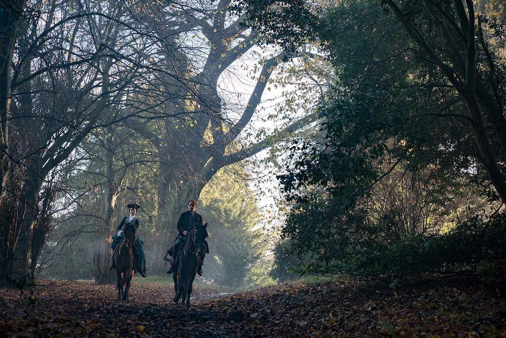 Cosmopolitan has an exclusive clip (HERE) of Jamie and his fellow groomsmen at Helwater. They draw straws to see who will be forced to accompany Geneva Dunsany (daughter of the Lord of the house) on her afternoon ride. Once you watch, you’ll see why no one is fighting for this “honor.” Geneva is horrendous! (She also looks and dresses like Claire, js.) However, her sister Isobel is quite amiable.
