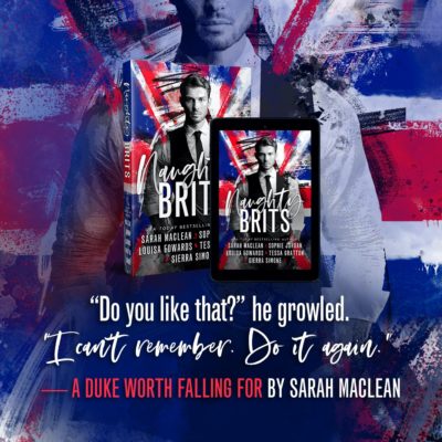 Naughty Brits features works by Sarah MacLean, Sophie Jordan, Louisa Edwards, Tessa Gratton, and Sierra Simone. It’s also MacLean’s first foray into contemporary romance! You can see the synopsis for each story below. I know you’ll want to one-click this one!